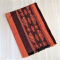 インドネシアのジャワ島にあるトロソ村で手織りされたイカット。全体的にオレンジ色に見えますが、実は、黄色と赤の細かいストライプ。黒や緑の糸も使って、エスニック柄を織り込んでいます。