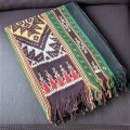 鮮やかなグリーンに、赤や黄色に染められた糸を使って幾何学的な紋様が表現されています。