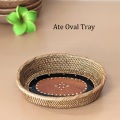 アタ製の楕円形トレーです。底部は木製で、三角形のシェルが嵌め込まれたデザインになっています。中央のシェルの配置はひとつひとつ異なっています。