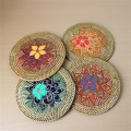 丸い木の板にカラフルなペイントを施し、アタで装飾した手作り品です。