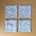 水色の地に淡いピンク色の花柄が織り込まれた布で作られたコースター。当店オリジナルのハンドメイド商品です。裏面は、紫色と紺色の2種類あり、同色4枚で1セットとなります。