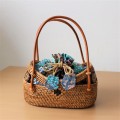 アタでしっかり編まれたハンドメイドのかごバッグ。持ち手部分は革です。